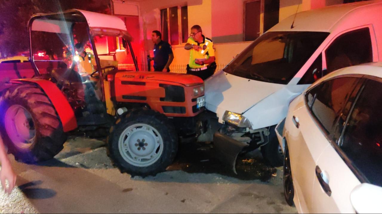 Bir süredir sürücüsüz olarak giden traktör, cadde üzerinde park halinde bulunan minibüs ve otomobile çarparak durdu.